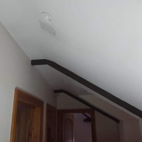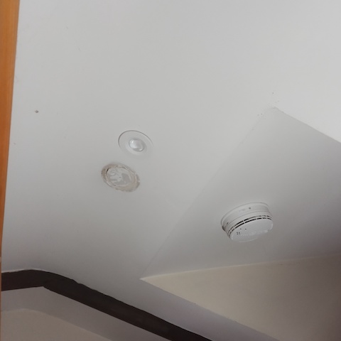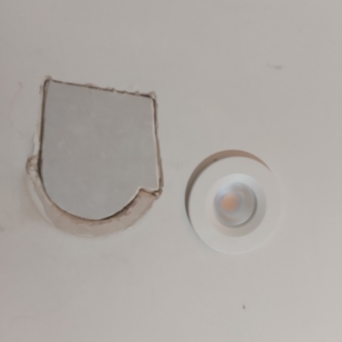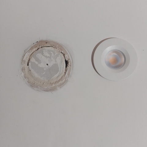 "Set" after Wednesday 27Sep2023 use "dot-and-dab" to bond in reiforcement/backing and patch where vacated previous light position. Given had to make smaller holes for new low-energy ceiling spot-lights.