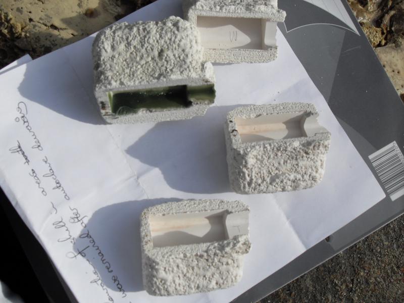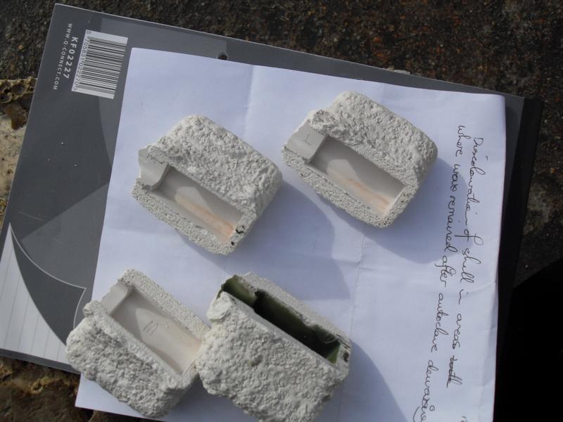 There is trapped residual wax pooling at the bottom of the product casting cavity as the shell stands in the dewaxing steam autoclave.