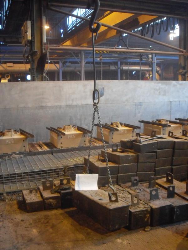 A 600kg weight, used to hold down the cope of large sand-castings, is hanging from the meeting of the "blade" with the "shank" of the mould-lifting tool by a chain bridle-set. This tests particularly the strength of the top-loop engaging crane-hook and the weld attaching the "blade" to the "shank".