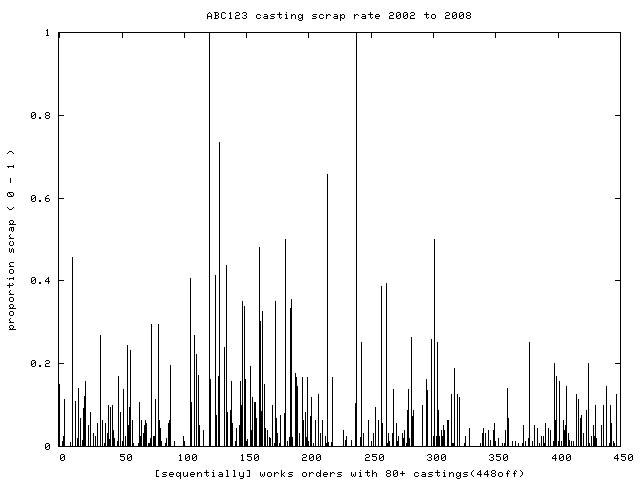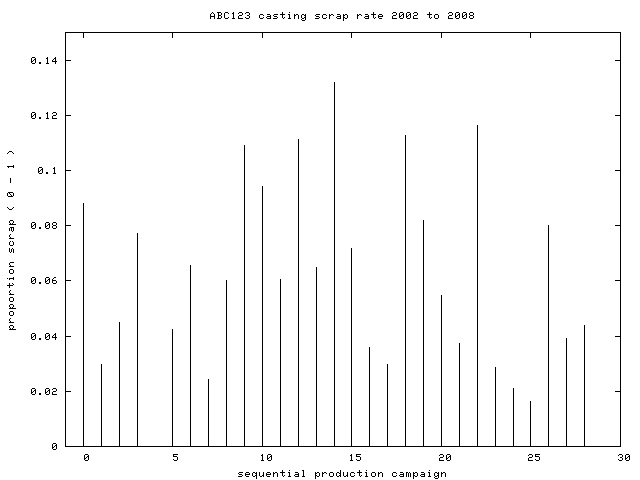 Casting "ABC123" was topical due to a recent chronic scrappage problem - something like having to 3-times over-manufacture to get the delivery quantity. It also transpired that "ABC123" had remained unchanged over 6 years of complete data to-date and had been manufactured on a consistent regular basis in this time. So as a "pilot study" this was a good one to go for.