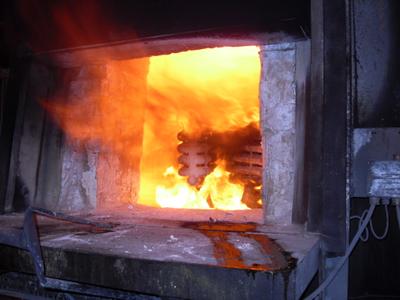 When dewaxed shells are loaded into the gas-burning rotary hearth furnace to be fired at 1050C prior to casting, a wild conflagration, duration about 10 minutes, of the type shown in following pictures and in this movie, often occurred.