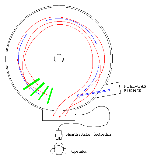Because the furnace atmosphere swirl is "leftward" as driven by the gas-burner, the fume has to do a long path - nearly a complete revolution of the furnace - before it meets the door. That gives temperature + time.