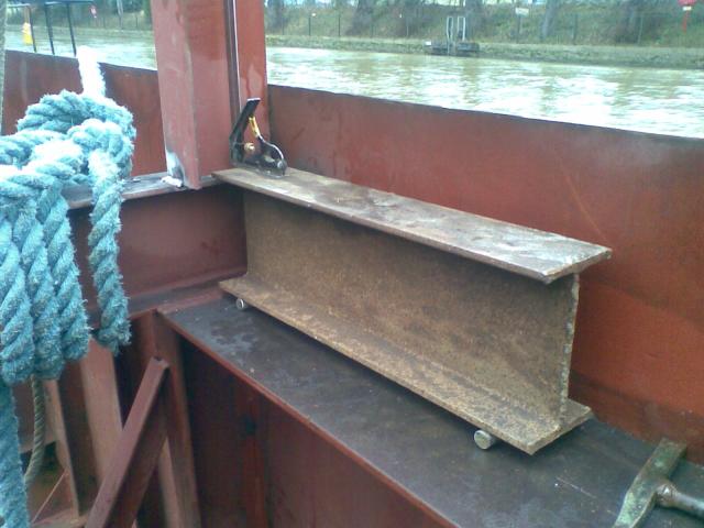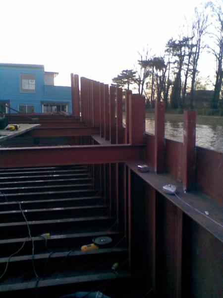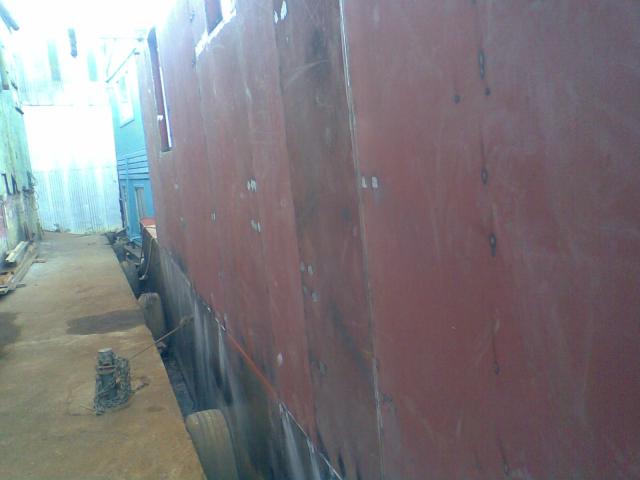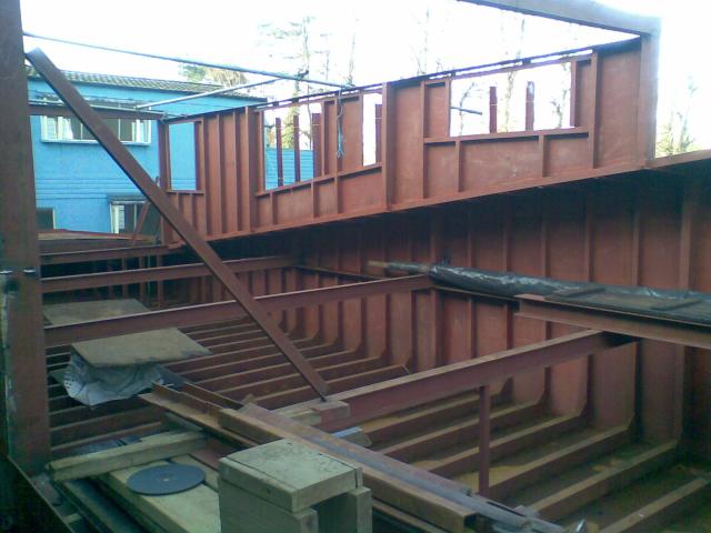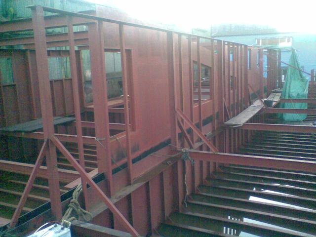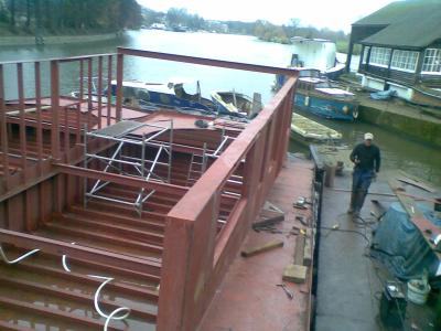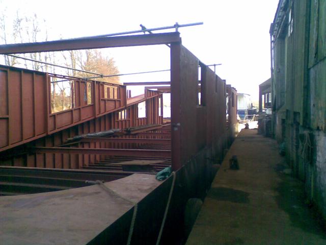 To interpret the image - there is the "sister" barge moored alongside to the left-hand-side of the image. My first work as foreman, seizing control of this largely stalled project, was to put up the superstructure structural and stiffener ribs rising off the "stringer" just below the top edge of the hull-side-plates, plus the top-plate delineating the top deck will start.