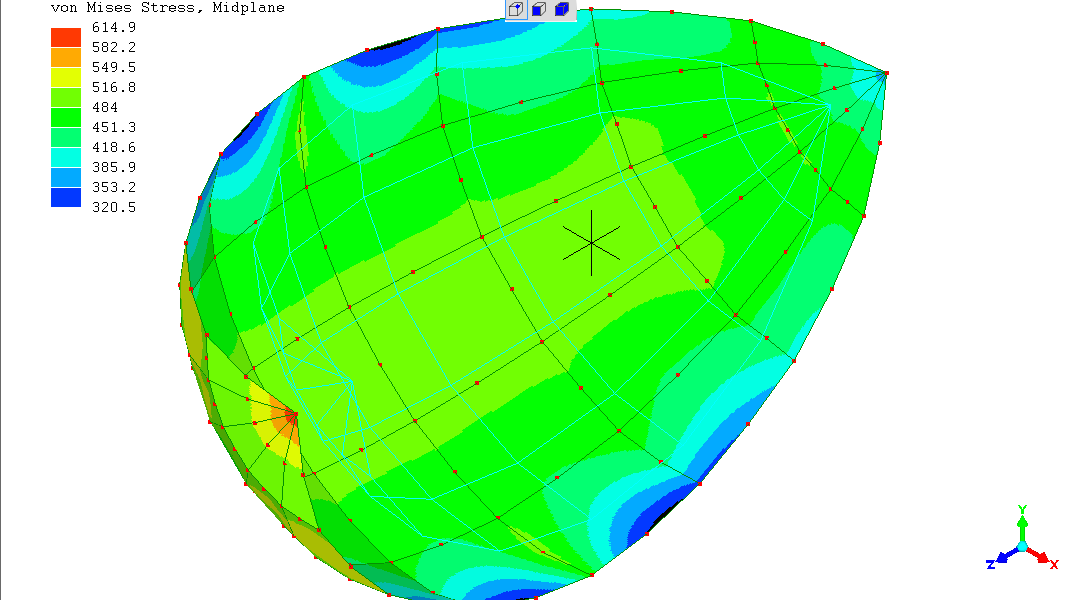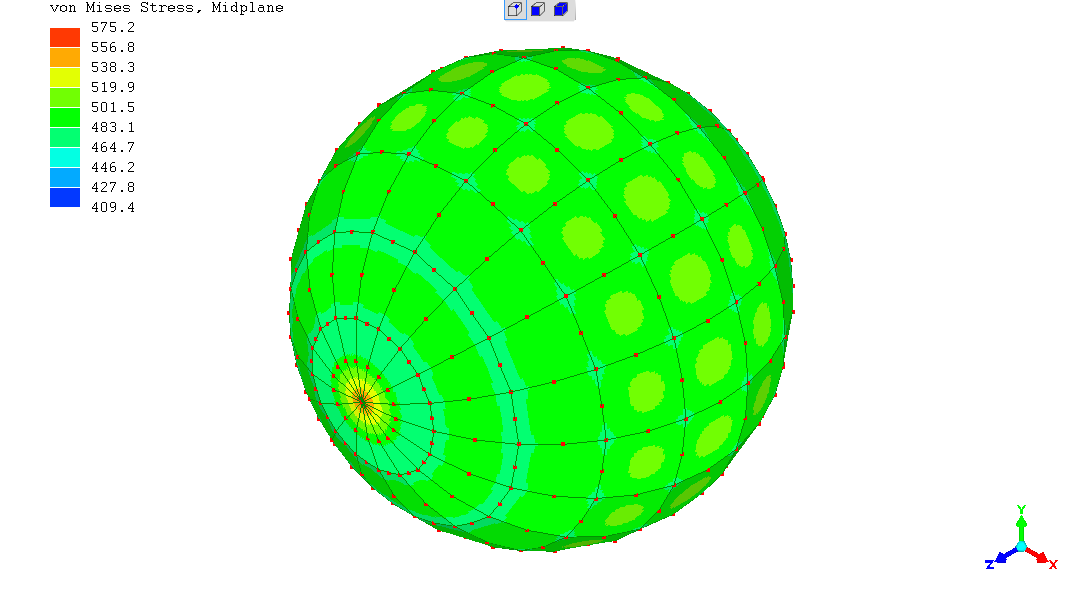 Struggling with the programs interface to highlight the plane-of-symmetry faces of a FEA model and define its "constraints", I made things easier for myself initially by defining a full sphere.