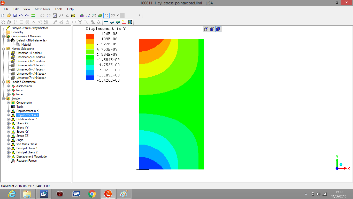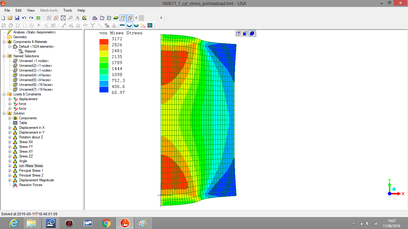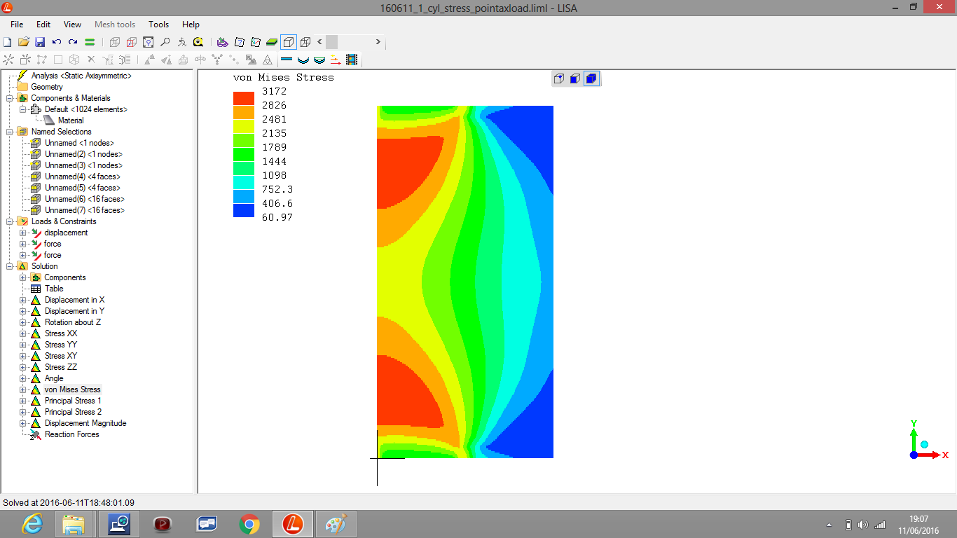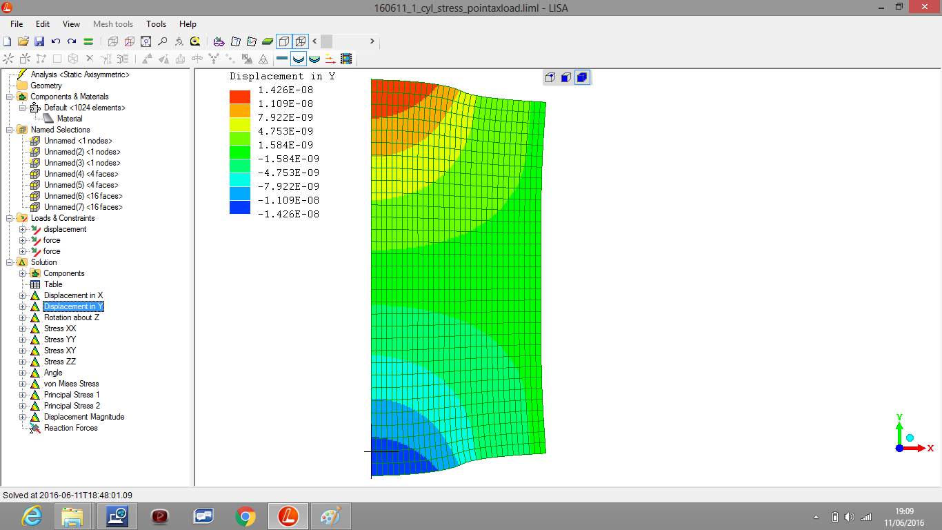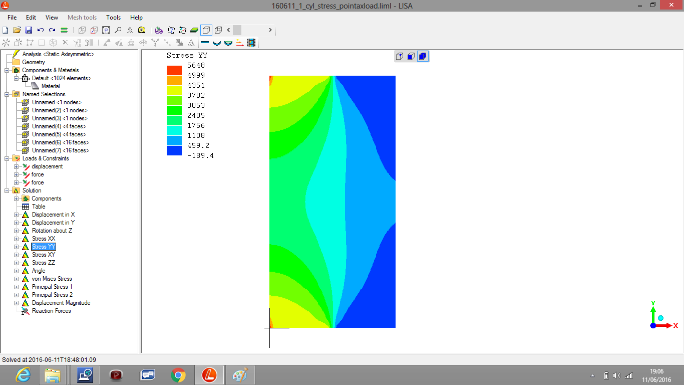 A bonus of defining an axisymmetric situation and using axisymmetric elements ( previously encountered ) is very efficient of computing resources and number of elements and nodes used, enabling a fine mesh for the very detailed computation.