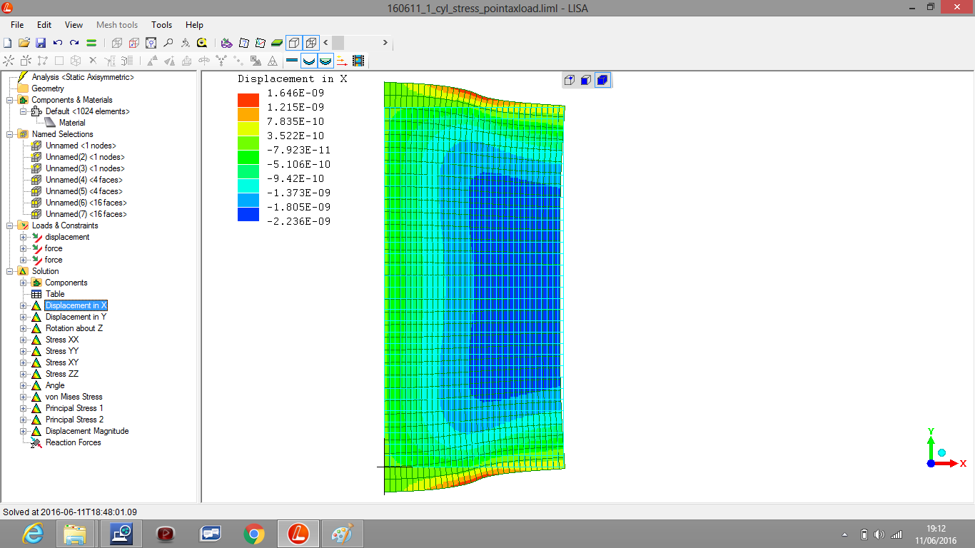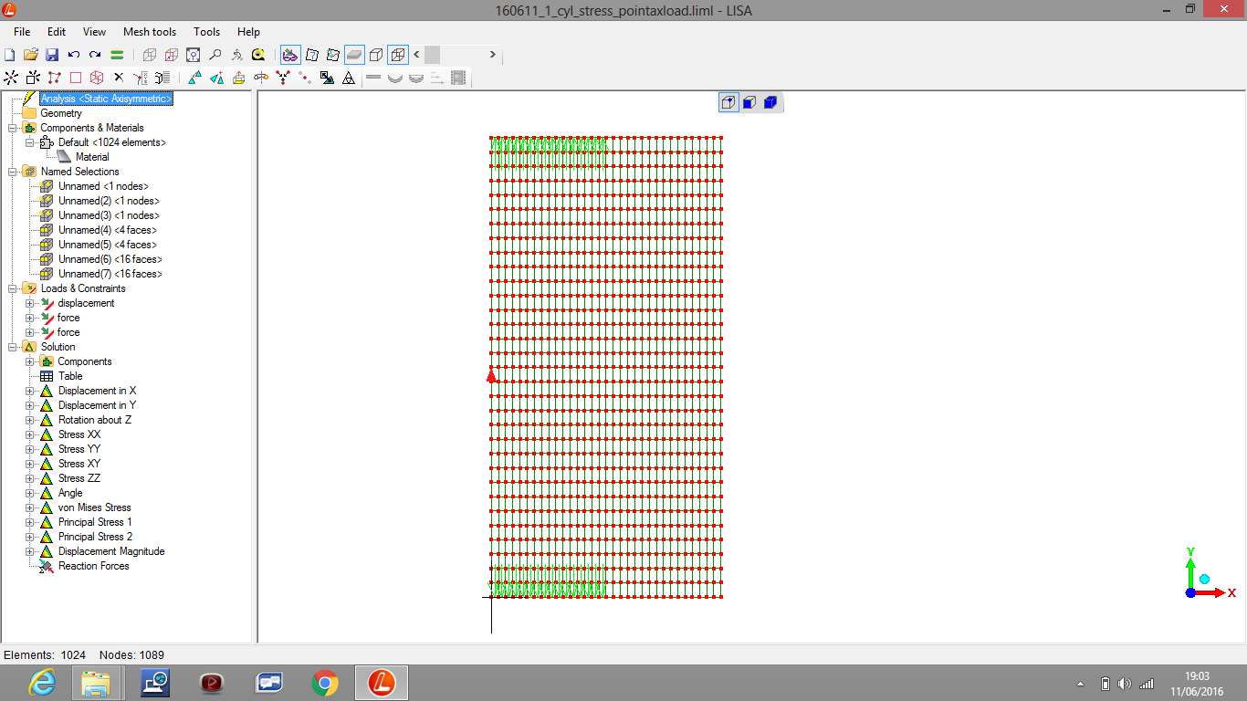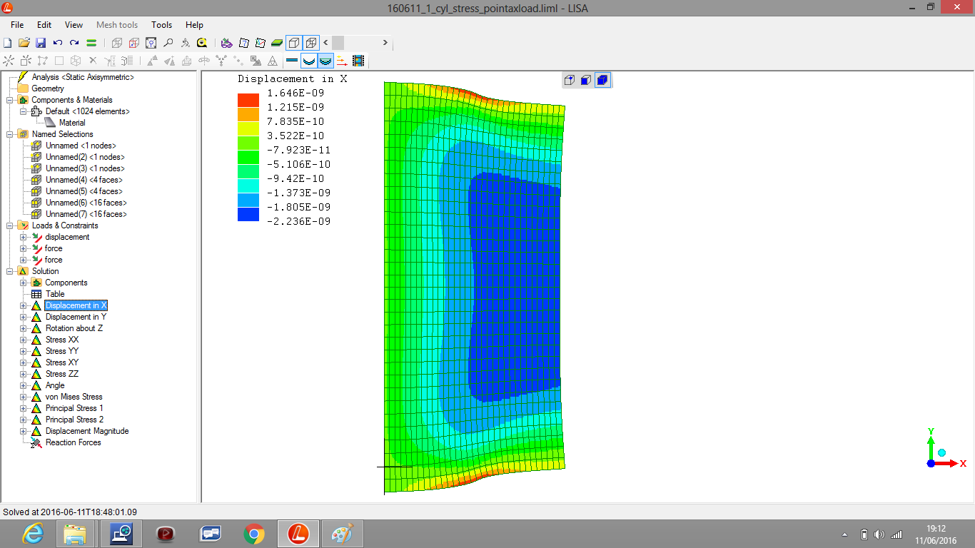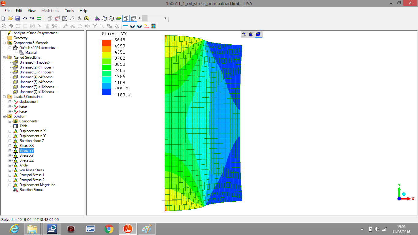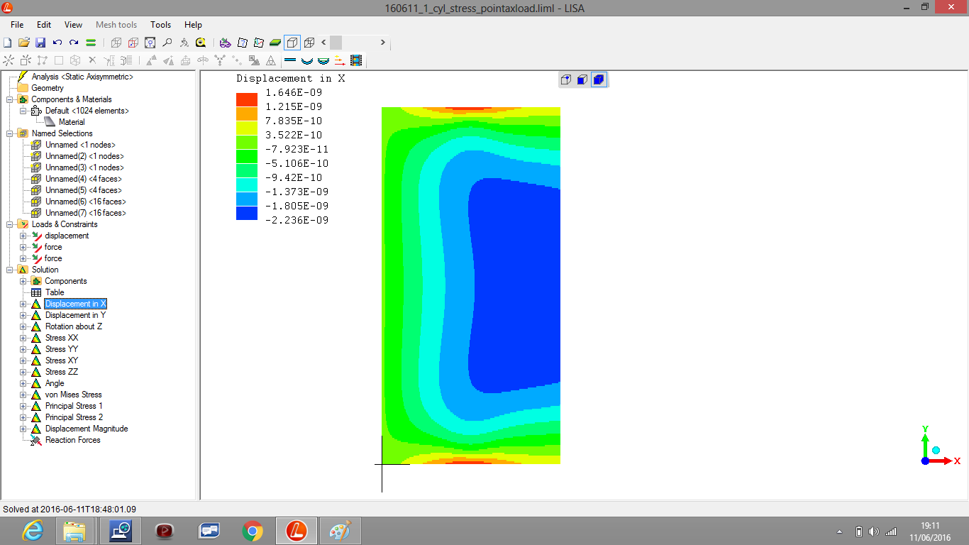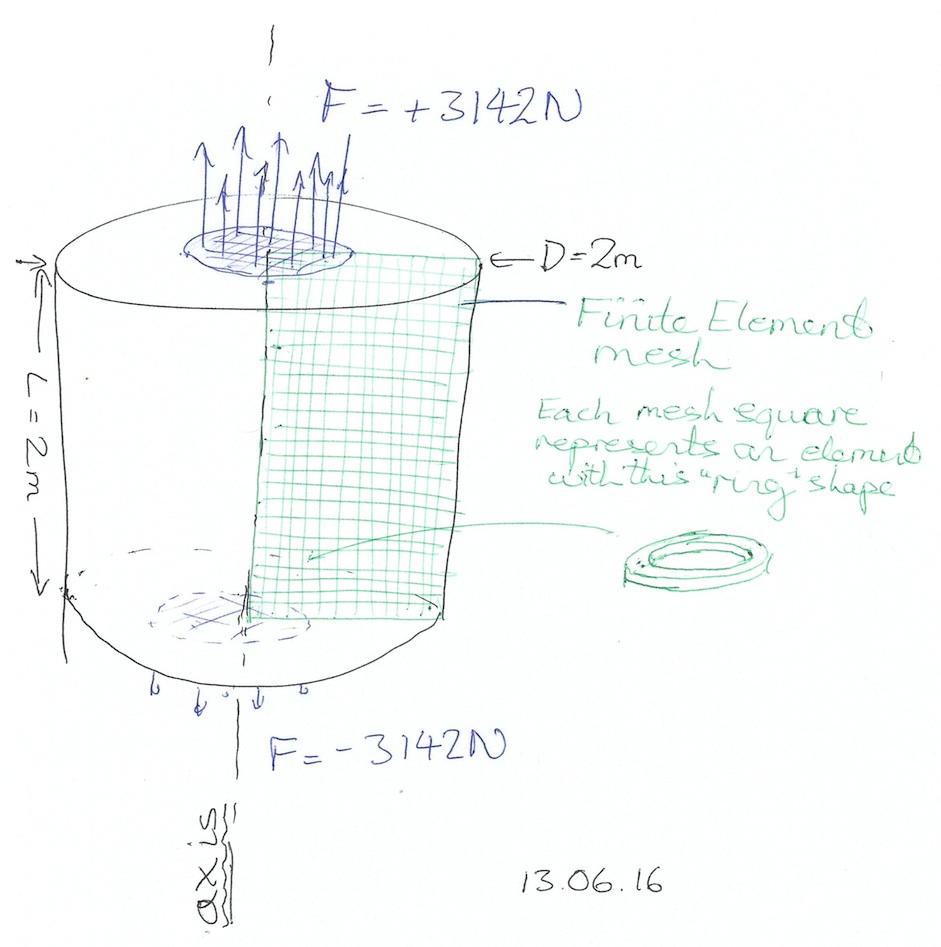 A bonus of defining an axisymmetric situation and using axisymmetric elements ( previously encountered ) is very efficient of computing resources and number of elements and nodes used, enabling a fine mesh for the very detailed computation.