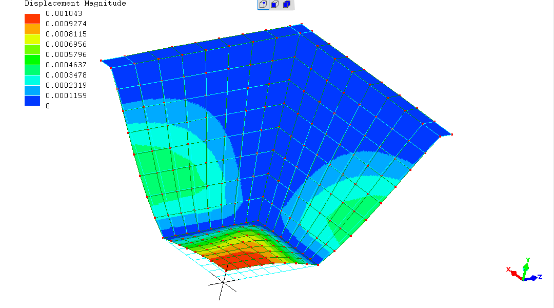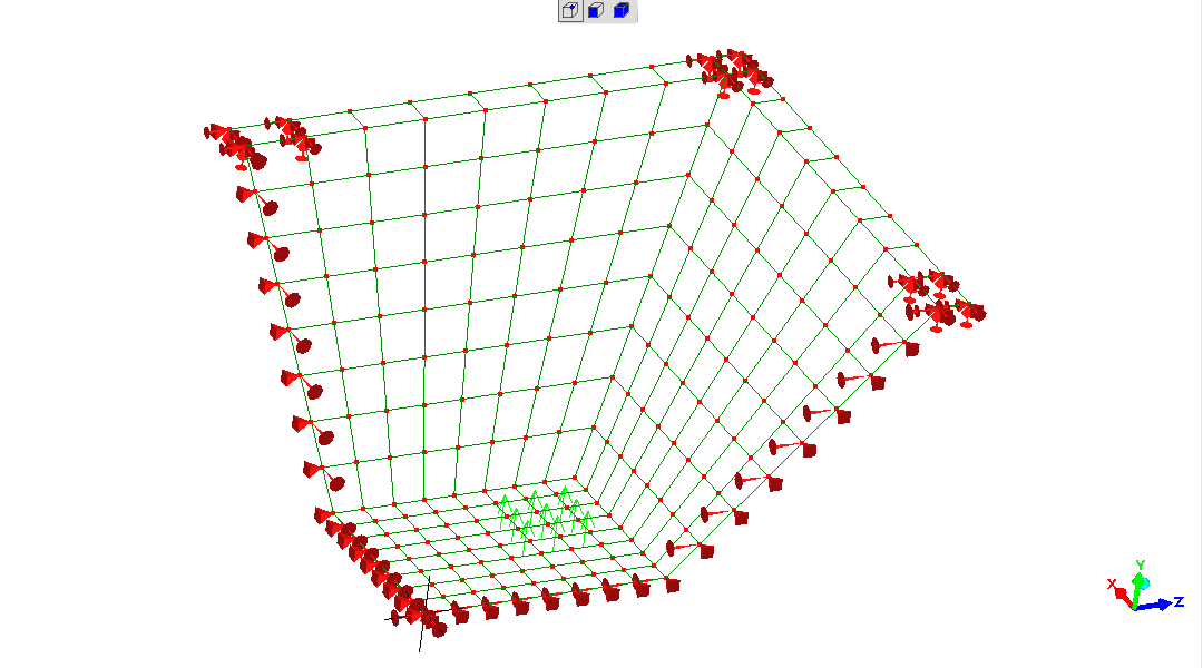The model. Fixed at "rim" at midpoints and corners; 10kN (1 tonne-force) upwards at each "corner" of the base.