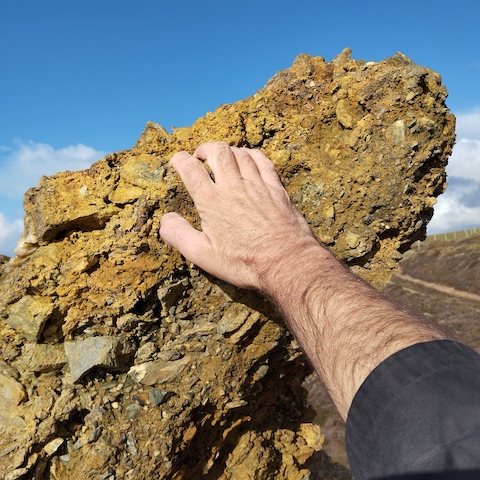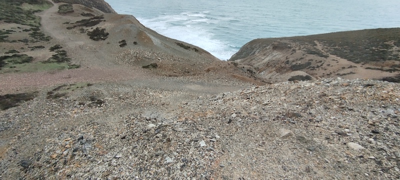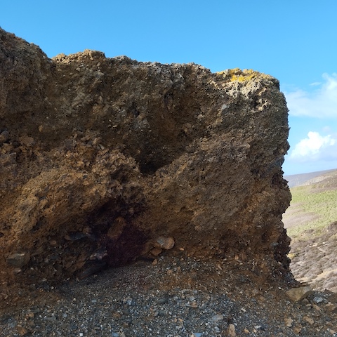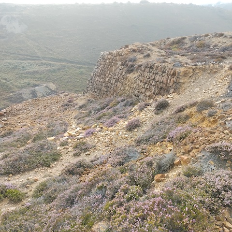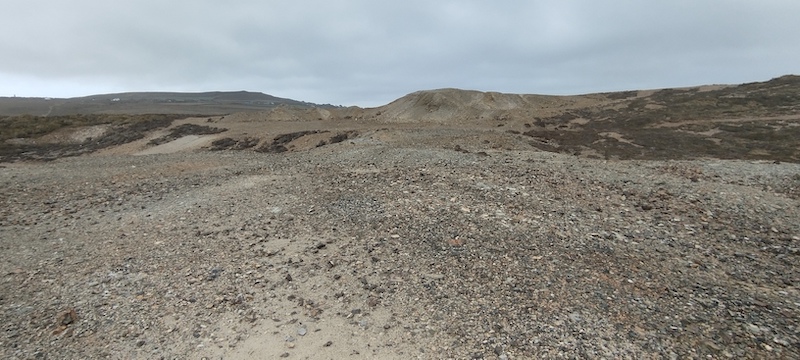 Again, what is seen is nothing growing on the arsenopyrite. The small size and large number of shafts nearby suggests "early" mining. Wary of writing my guess centuries since abandonment. But emphasising that absence of vegetation is for systematic reason. Presumably of the suphide'y arsenical conditions.