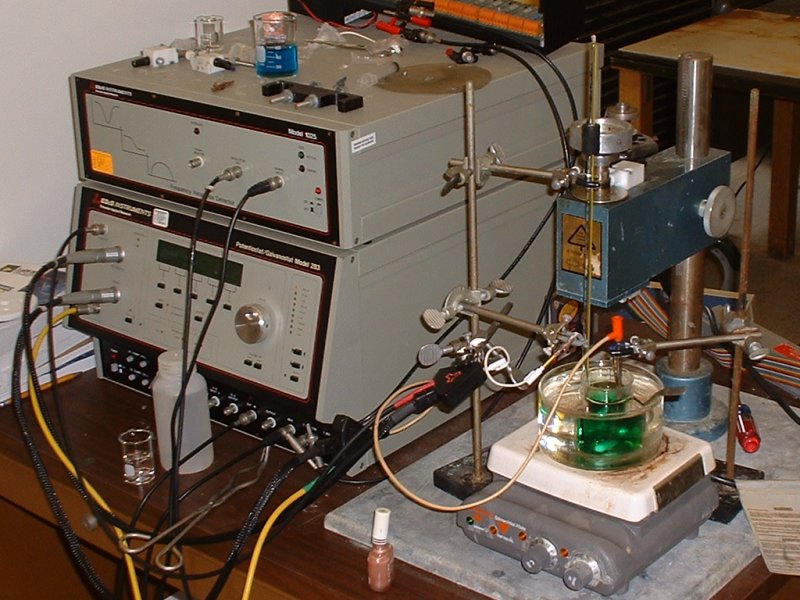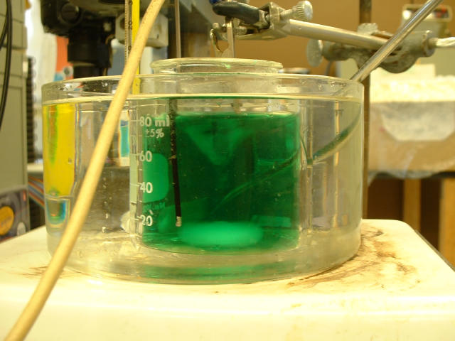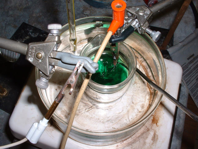 The current density needed is so high that this lab. power supply could only plate a "window" about a millimetre square, which was left after Mrs Professor xxxx's nail-varnish had covered all the rest of the immersed area (note pink bottle mid-lower top picture - return required against threat of disruption to domestic harmony).
