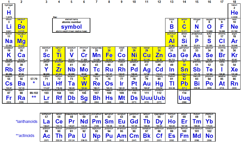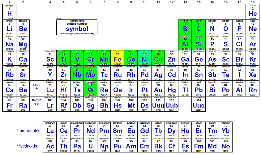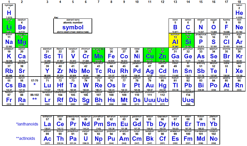 Looking at Aluminium (yellow) - some common alloying elements (green)