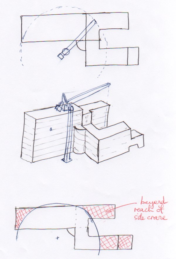 First - context. When fitting steel details on concrete buildings, the site crane often cannot cover the entire site. There were two or more cranes during the concrete pour - but that was expensive in crane hire and the obligation to have a Crane Coordinator directing lifts and ensuring cranes did not collides with each other in their arcs of overlap. So now with the concrete "frame" structure up, there is one tower crane remaining while all the other Trades fit-out the building. Sketched is what the situation might be like: