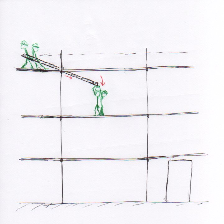 The first one on that amazing day was to "handball" (manually carry) the steels down the scaffolding-stairway. Scaffolding-stairways are very lightweight, swaying around at the best of times. And the best of times didn't prevail in this case. Scaffold stairways provide a requirement for there should be more than one way of leaving to workplace, so that one event cannot both create a danger and deny an only escape route. And they are an open framework. So when the inevitable trip happens, like as not the steel goes flying out on the stairway and has free fall 5 floor levels down onto the busy working area below.