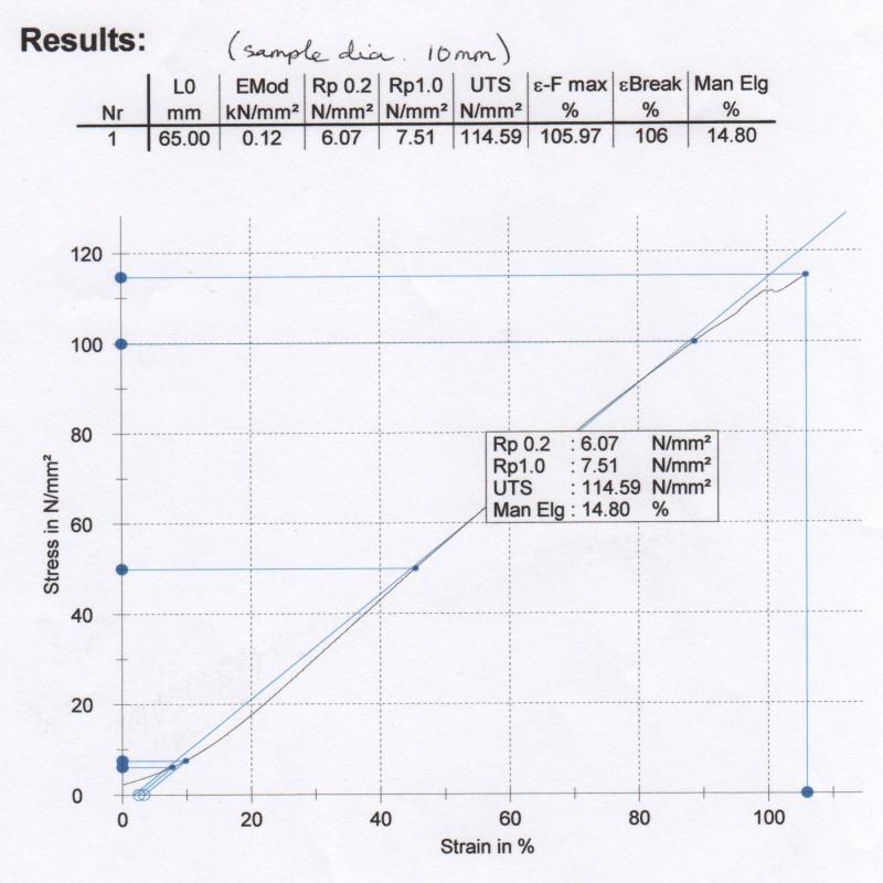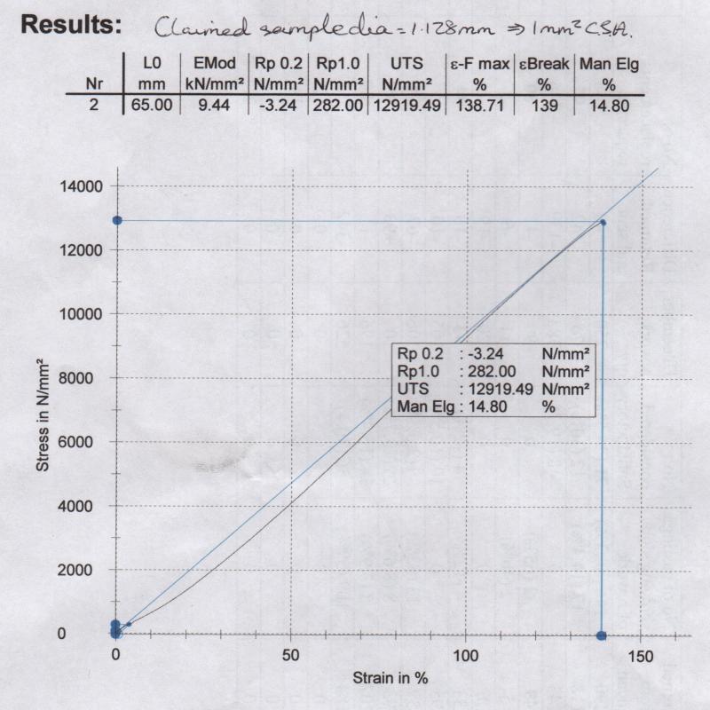 Practical point for tensile plots. Because materials scientists think of "stress" (force/unit-area), the computer-controlled tensile tester insists on outputting stress. It took until a couple of tests gone by to realise that if I dishonestly told the testing machine my sample is 1.128mm diameter (thus cross-sectional-area = 1mm), it would trick the output plot vertical axis to read the tensile load (force) on the rope in Newtons.