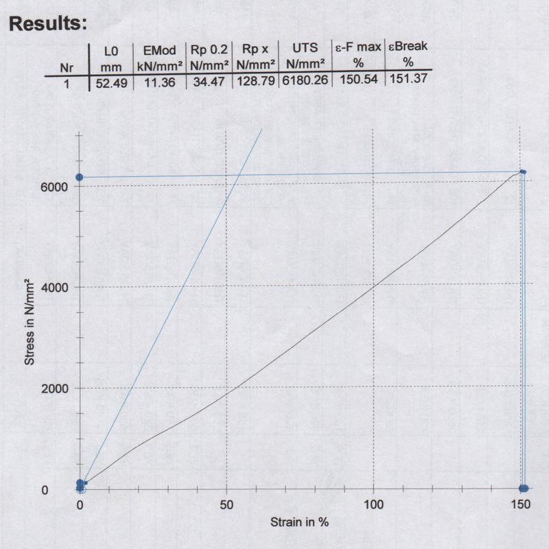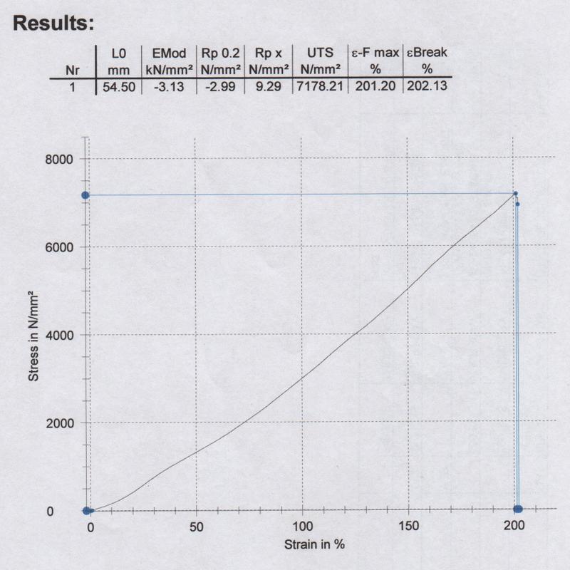 Tests on a short-splice are shown elsewhere. It was not possible to know their ultimate properties because slippage of the strands as the splice bunched-up in the middle under load used up all the travel of the tensile tester. Hence no test result.