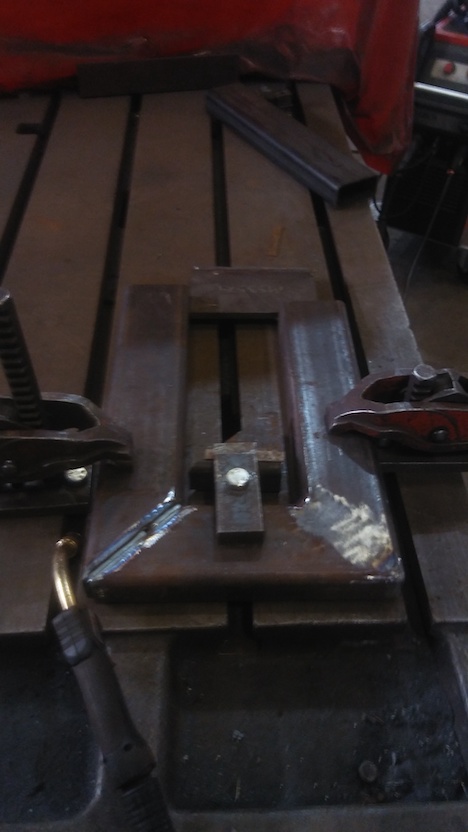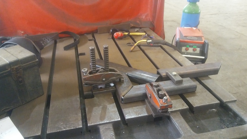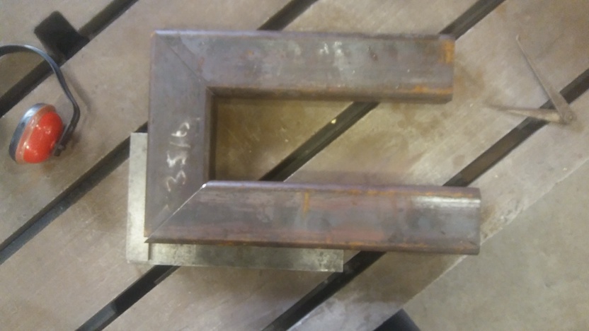 Weld prep. ground 60deg(included) single-V of mitred joint. Clamped and restrained by triangulations for welding. The fab. exercise has me finding great kit. These clamps which fit the stiff level accurate welding bench!
