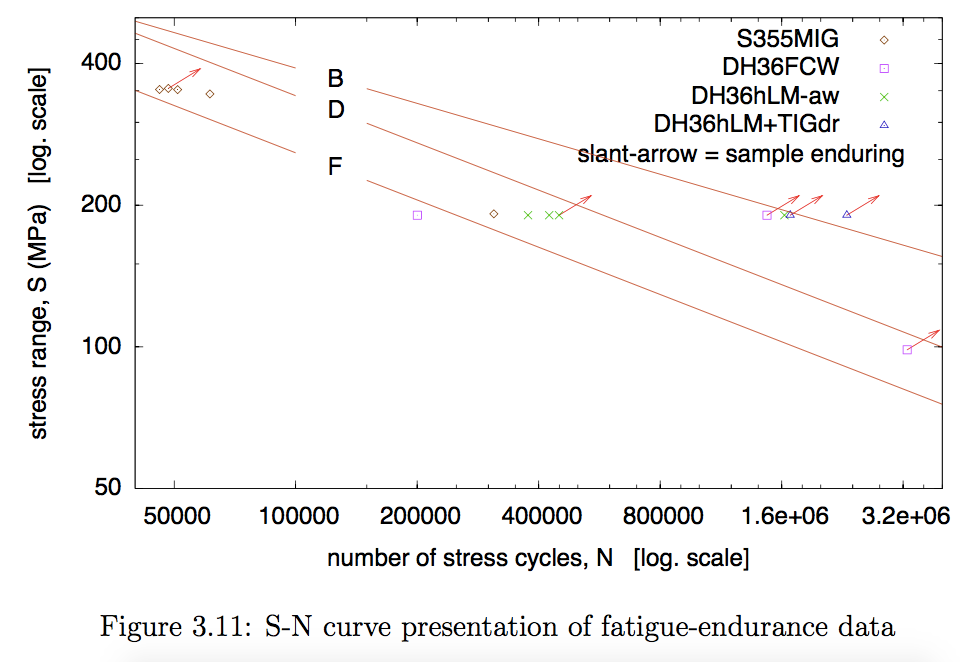 The other "DH36FCW" purple square for the comparable test, but with the sample welded according to the WPS, is found just under the "Class F" line. Which is the historically expected performance of a fillet weld, where it broke at "N=200000".