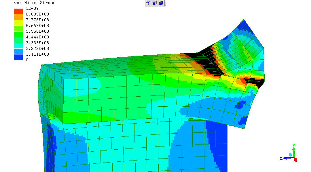 Black regions around plane where weld metal joins the top surface of the RHS is where stresses exceed 1GPa.