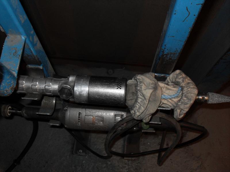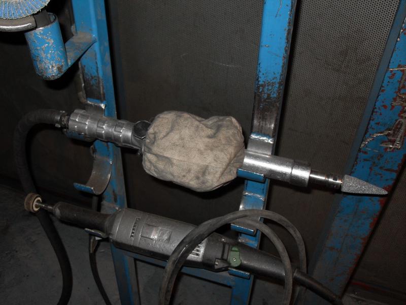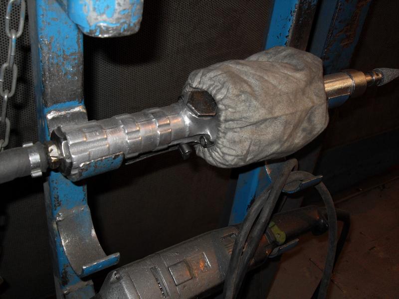 Here is the die-grinder running. Sleeve inflates at low pressure. Can hold die-grinder at any angle of rotation - direction of exhaust port is now irrelevant. The 2 layers of sleeve between the air exhaust and the outside world stop the oil mist.