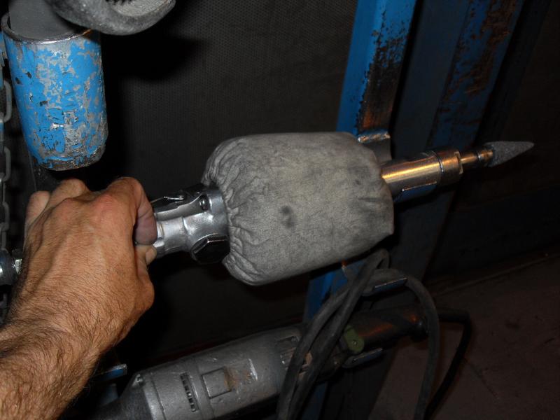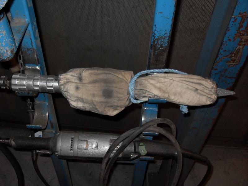 Constrictor Knot at front holds sleeve in place just behind hand-grip part of die-grinder.