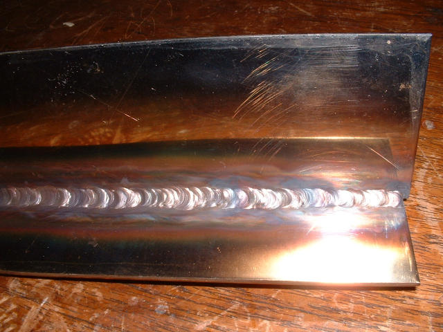 Hand exercises eventually produced something of a break-through, in that in the end a rhythm set in where I could watch and the feeding of the filler wire and progression of the torch took over as a sort of programmed reaction, coupled to what I was seeing happening in front of me. I was also coupling in controlling on the foot pedal for power. But still the result was not perfect, as the following pictures show.