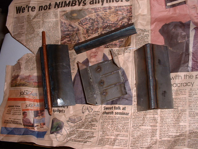 The test-piece with which I qualified for outside-corner weld (my first). Sawn-up with inspected and nick-break test pieces tack-welded to largest remaining piece