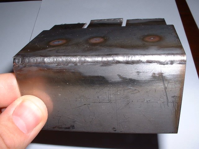 Here's the back-purging issue demonstrated. The following two pictures are of the outside and penetration sides of the same outside-corner TIG weld of stainless steel.