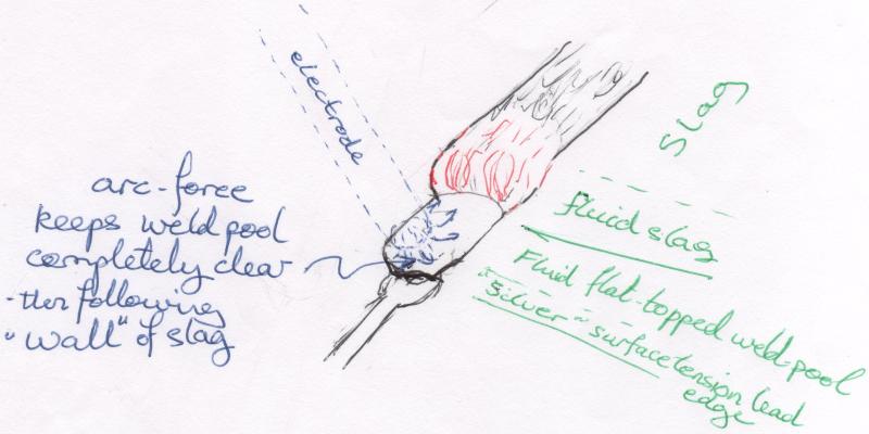 Identifying this came with diagnosing the reason for faults including porosity seen in the radiograph of a 5G weld. This appearance of weld-pool, "the fingernail", is readily obtained in 2G welding and was familiar to me in this context.