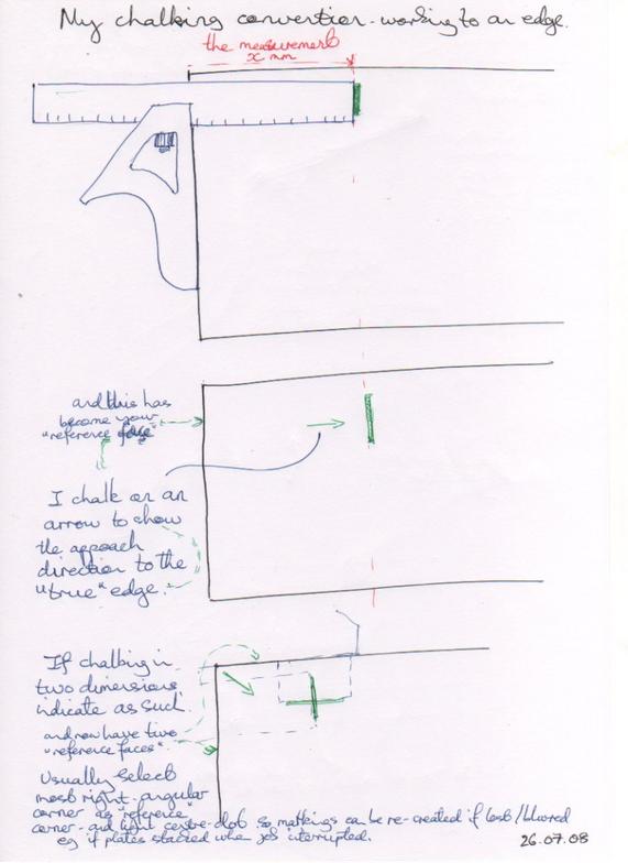 "Black" steel (hot-rolled steel plate and sections) are marked up with soapstone ("chalk"). The tools used are combination-squares, tape measures and engineer's squares.