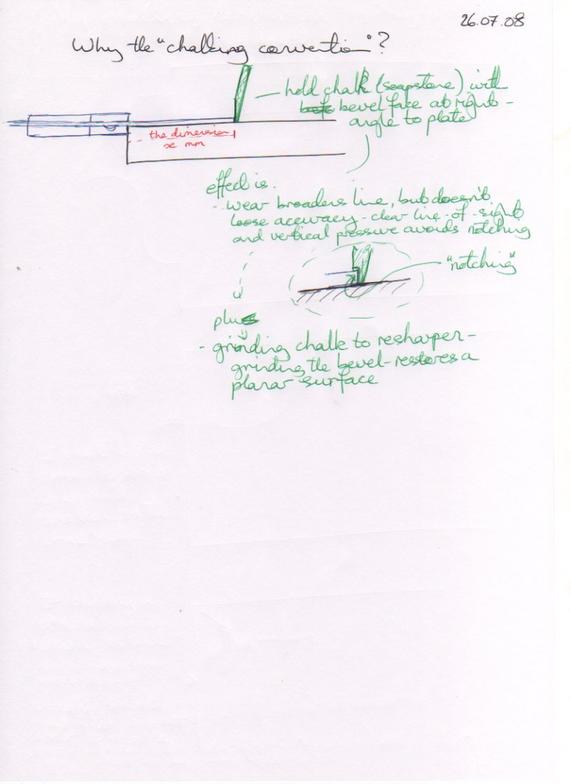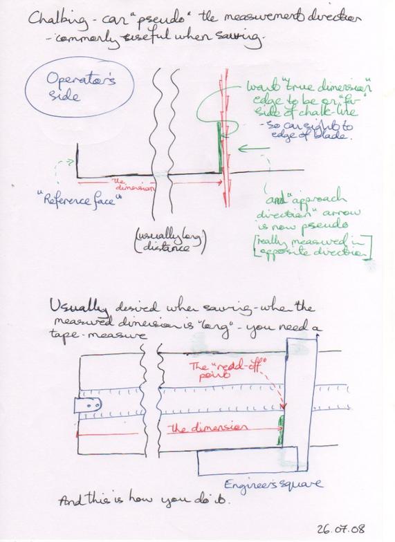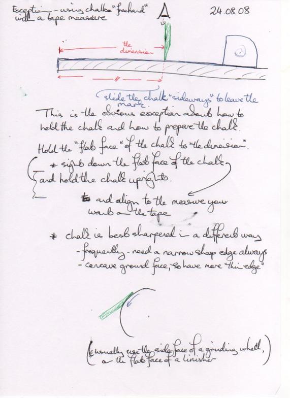 This case has a couple of differences to the above suggestions. When marking out a length holding the chalk "freehand" while reading a tape-measure, the way you hold the chalk and the best way to sharpen it are different.